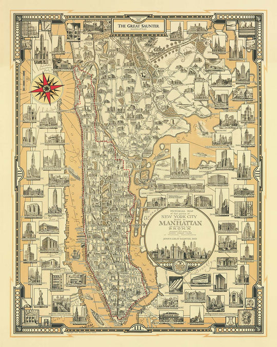 Manhattan: The Great Saunter, Route Map by The Unique Maps Co. and Chase, 1939: Personalisable, Central Park, Statue of Liberty, Empire State Building, Harlem