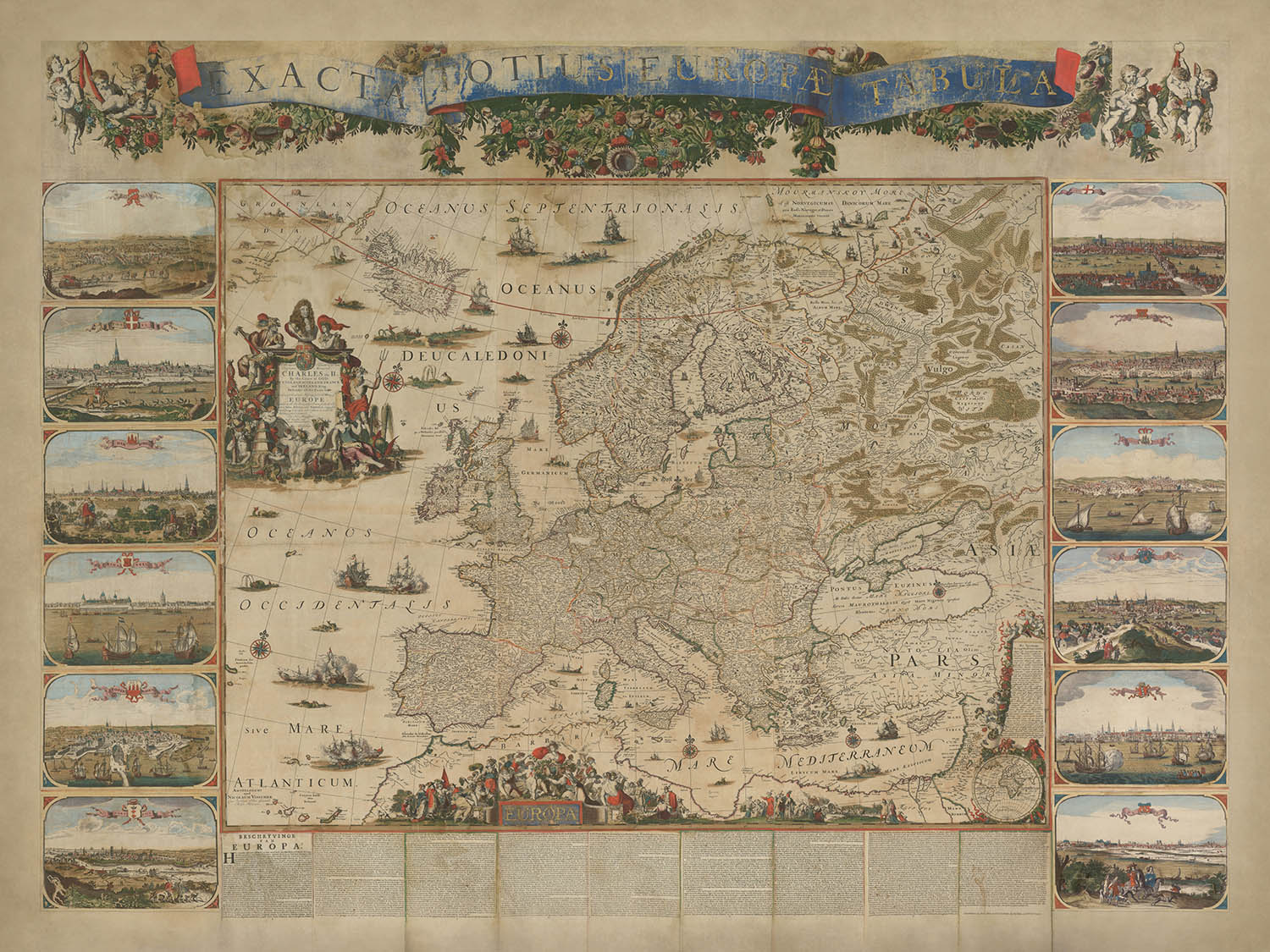 Visscher’s artistic brilliance is on full display in this map, which blends cartographic precision with elaborate decorative elements. The map’s central focus is a detailed rendering of Europe, featuring meticulously drawn coastlines, rivers, and mountain ranges. Surrounding the map are vibrant allegorical illustrations, including a portrait of King Charles II, maritime scenes, and symbolic depictions of unity and power. These embellishments elevate the map from a practical tool to a work of art, reflecting the grandeur and aspirations of its time.