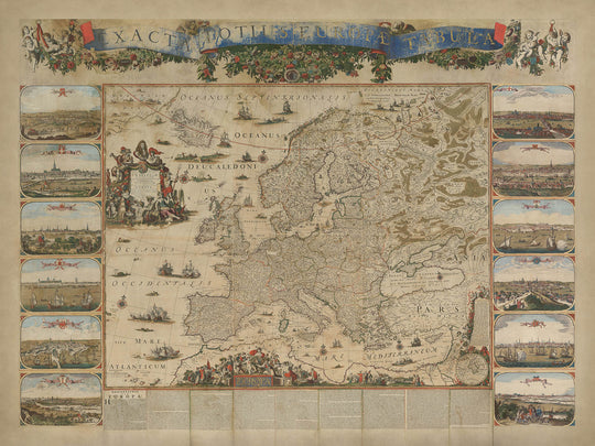 This map is not merely a depiction of land and sea but a celebration of Europe’s cultural and political landscape. The surrounding illustrations of major cities—such as London, Paris, and Amsterdam—capture the architectural splendor and significance of these urban centers. Ships dotting the oceans and seas evoke the era’s maritime dominance, while the ornate cartouches and banners add a layer of regal elegance. Nicolaes Visscher II’s "Exacta Totius Europae Tabula" is a masterpiece that transcends its cartographic purpose, offering a window into the artistry, history, and diplomacy of a bygone era.