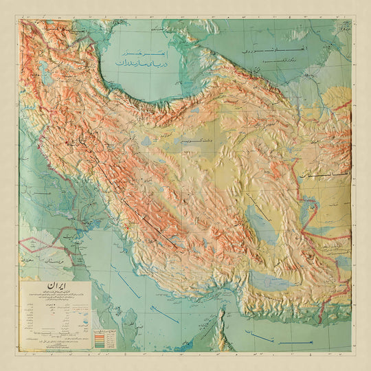 Step into the storied landscapes of mid-20th-century Iran with this exceptional 3D relief map, originally titled "ایران (Iran)." Crafted in 1950 by the renowned Aero Service Corporation, this map is more than a geographical artifact—it is a vivid testament to a pivotal era in Iranian history. The raised topography invites you to trace the dramatic contours of the Zagros and Alborz mountain ranges, while the shimmering expanses of the Caspian Sea, Persian Gulf, and Gulf of Oman define the nation’s natural boundaries. Each feature is meticulously rendered, capturing the grandeur and complexity of Iran’s terrain at a time when its natural resources were commanding global attention.