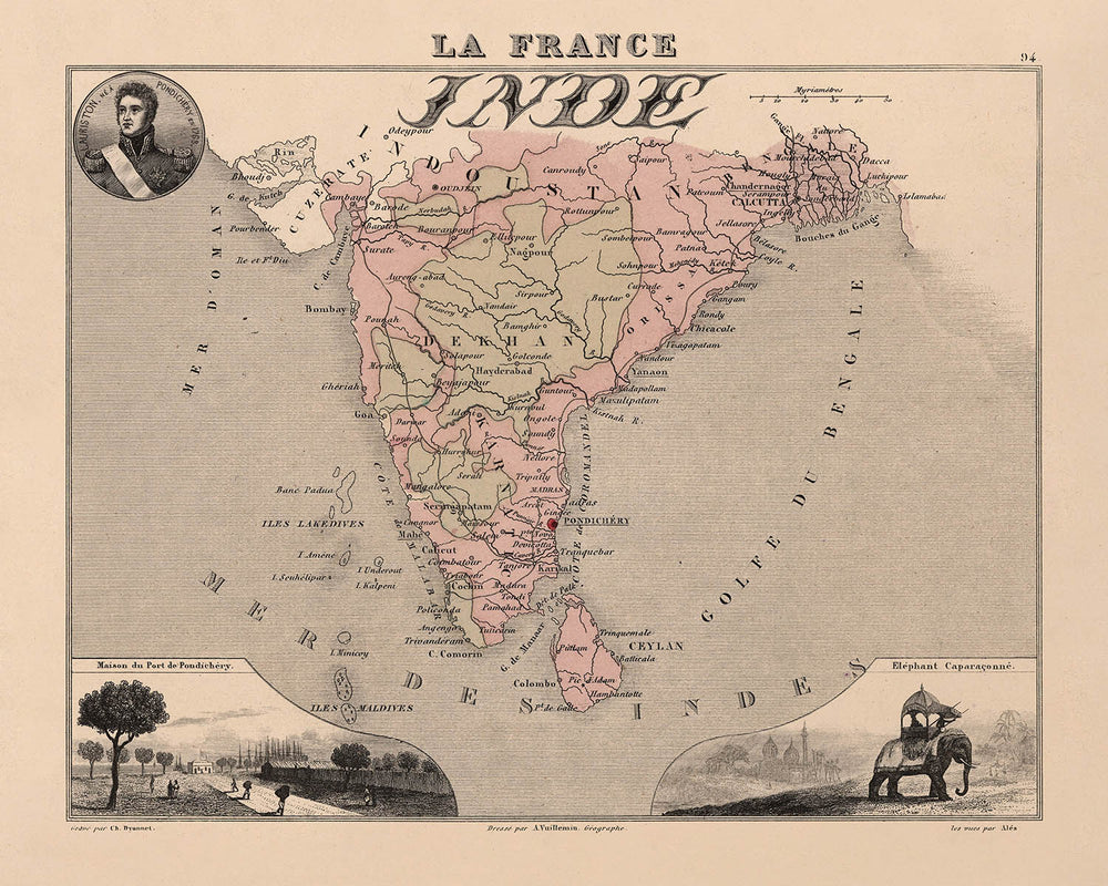A. Vuillemin was renowned for his ability to merge scientific cartography with artistic flourish, and this map is a quintessential example of his craft. Each region—Pondichéry, Karikal, Mahé, Yanaon, and Chandernagor—is carefully rendered, with boundaries crisply defined to highlight the French presence amid the vast British-controlled Indian subcontinent. Vuillemin’s work is further distinguished by the inclusion of local scenes, notable personages, and coats-of-arms, all meticulously illustrated to evoke the unique identity of each enclave. His attention to detail not only enhances the map’s aesthetic appeal but also serves as a valuable historical record of a bygone era.