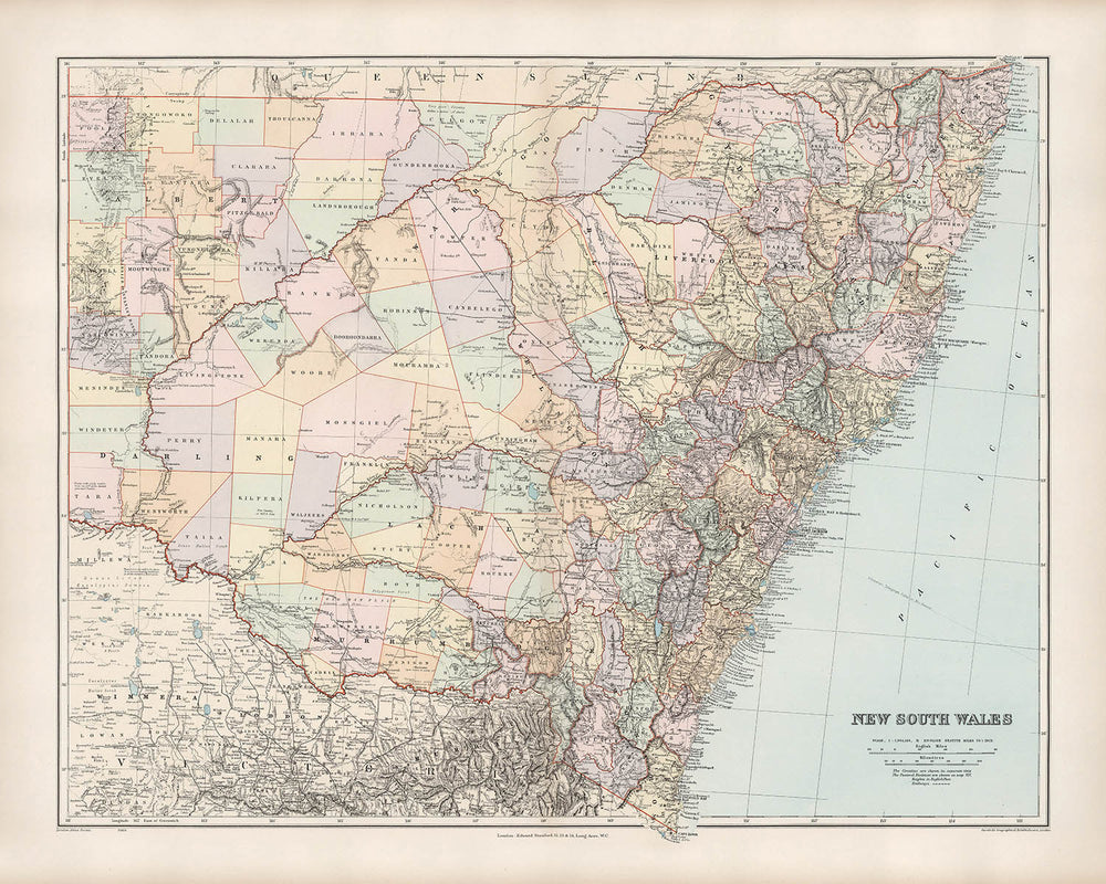 The map titled "New South Wales" by Edward Stanford, crafted in 1904, is a testament to the art of cartography at the turn of the 20th century. Stanford, a prominent figure in the world of mapmaking, acquired the plates of John Arrowsmith's London Atlas, allowing him to build upon a legacy of detailed geographical documentation. This map is part of an atlas first issued in 1887, succeeding Arrowsmith's work from 1858. The intricate design and vibrant full-color lithography make it a standout piece, reflecting both political and physical landscapes with precision and artistry.