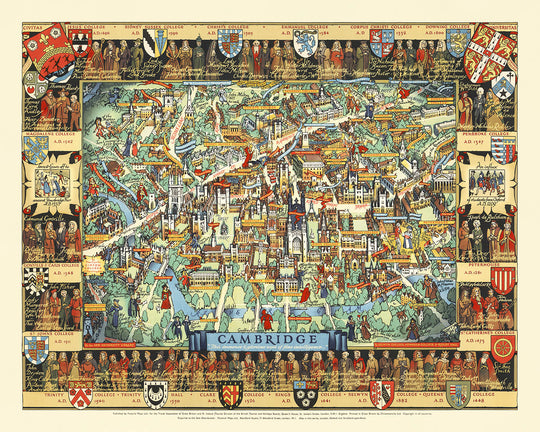 - Decorative borders with historical figures, coats of arms, and college founding dates.