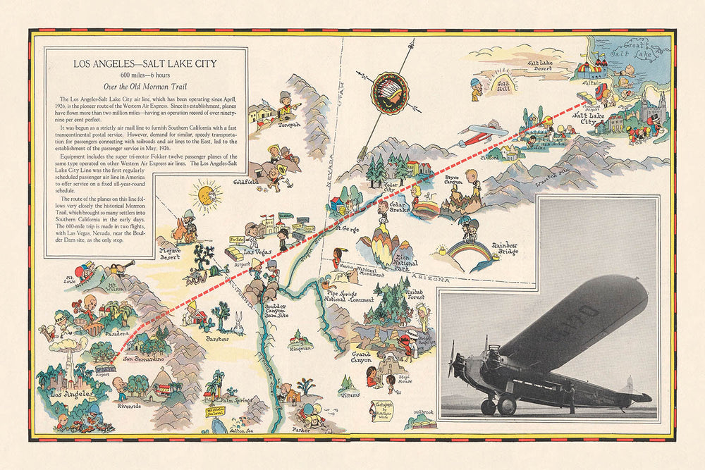 Pictorial Map of Los Angeles–Salt Lake City Air Route, 1929: Western Air Express, Tri-Motored Fokker, Las Vegas, Great Salt Lake, Zion National Park