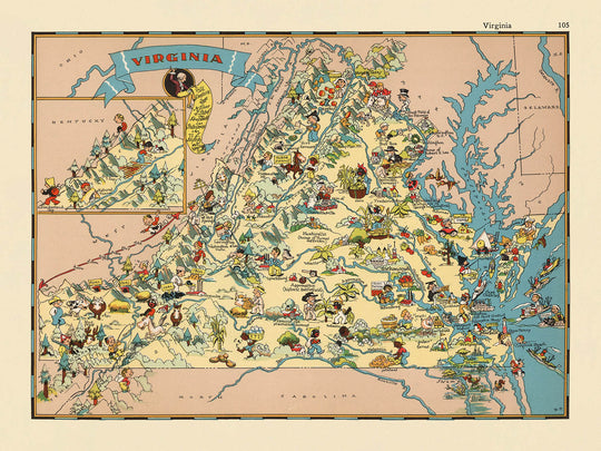 Step into the captivating world of 1930s Americana with "Virginia," the original title of this enchanting pictorial map crafted by the renowned Ruth Taylor White in 1935. This map is a vivid celebration of Virginia’s unique identity, brought to life through White’s signature blend of whimsy and artistry. Each corner of the state is adorned with colorful illustrations that evoke the essence of Virginia’s landscapes, traditions, and storied past. As a centerpiece of any collection, this map offers a portal to an era when cartography was as much about storytelling as it was about geography.