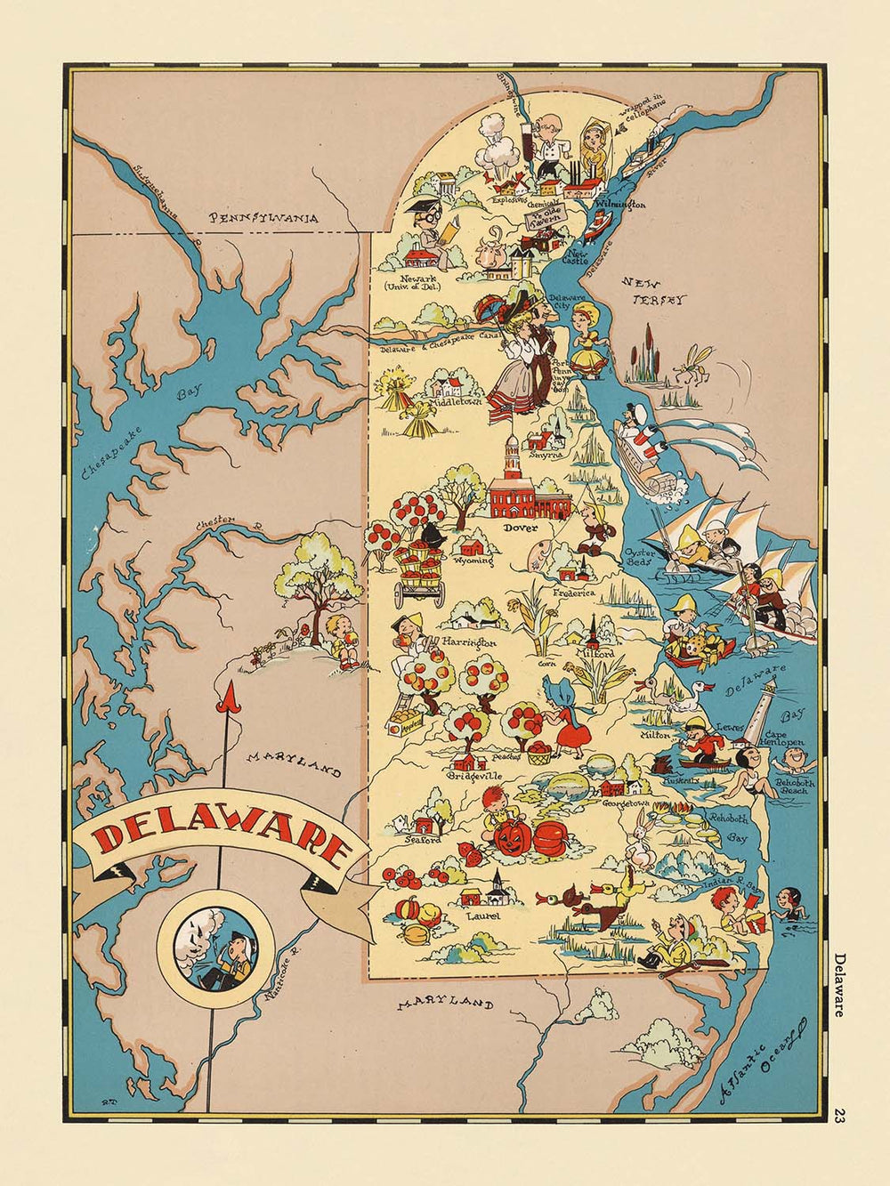 Pictorial Map of Delaware by Ruth Taylor White, 1935: Wilmington, Dover, Delaware Bay, Beaches, First State