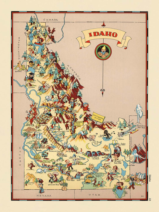 Natural beauty is a central theme, with the map’s illustrations of mountains, rivers, and wildlife capturing the grandeur and diversity of Idaho’s landscape. The iconic Snake River meanders through the state, its course marked by playful imagery of fish and waterfowl. Exaggerated mountain ranges, lush forests, and roaming deer evoke the untamed spirit of the land, while the absence of specifically labeled national parks or historic landmarks allows the broader scenic and cultural tapestry to take center stage. This artistic approach makes the map both a decorative treasure and a fascinating historical document.