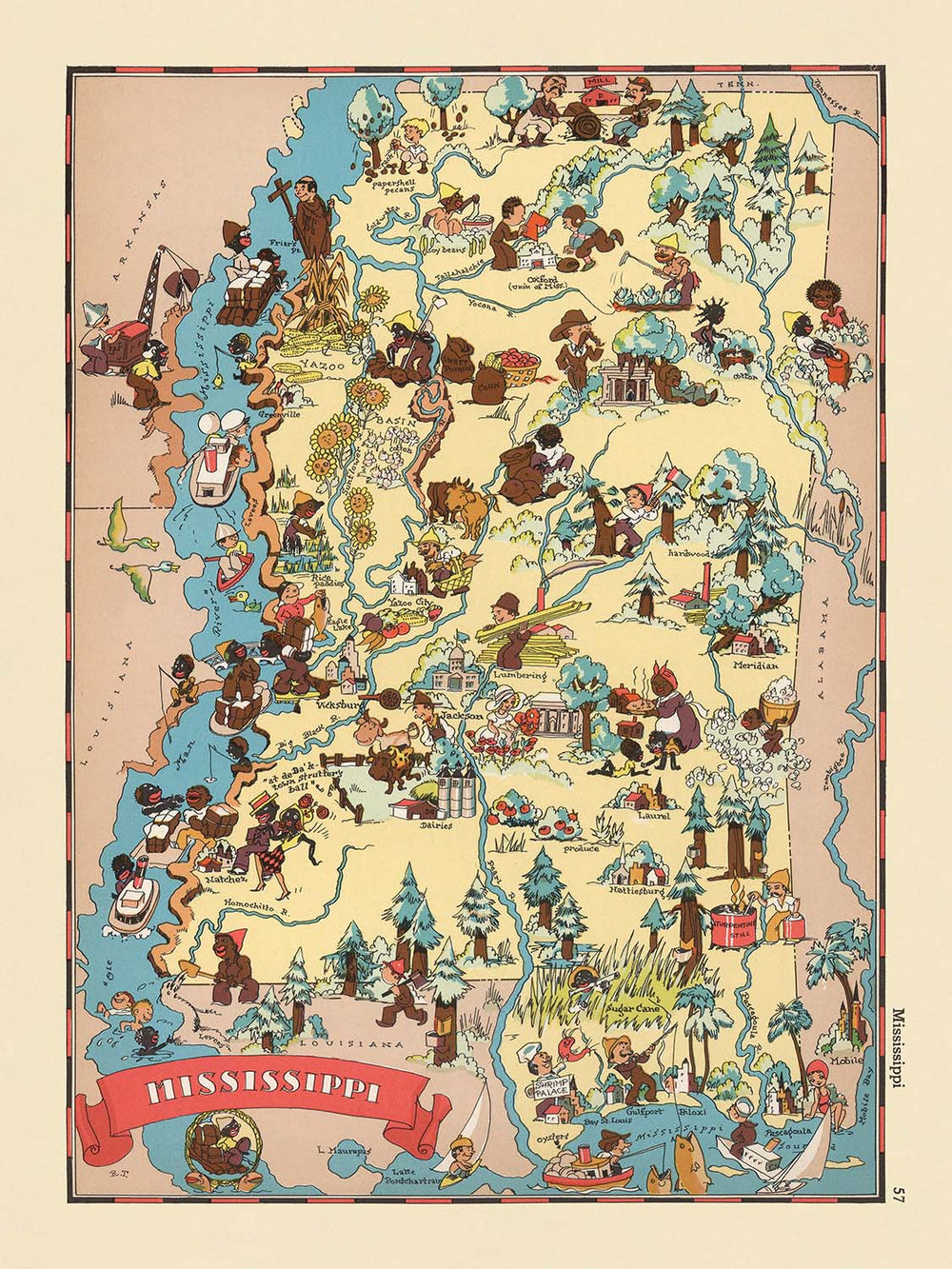 Pictorial Map of Mississippi by Ruth Taylor White, 1935: Jackson, Gulfport, Mississippi River, Cotton Fields, Riverboats