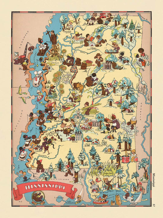 The map’s artistry is evident in its depictions of Mississippi’s defining features: the mighty Mississippi River winds majestically along the western border, while illustrations of cotton fields, riverboats, and abundant wildlife evoke the state’s deep agricultural roots and natural bounty. Scenes of fishing, hunting, and musical gatherings hint at the traditions and pastimes that have shaped Mississippi’s social fabric. These lively vignettes not only highlight the economic lifeblood of the region—such as cotton and corn—but also nod to the state’s musical heritage, alluding to the blues and other cultural legacies born along these storied banks.