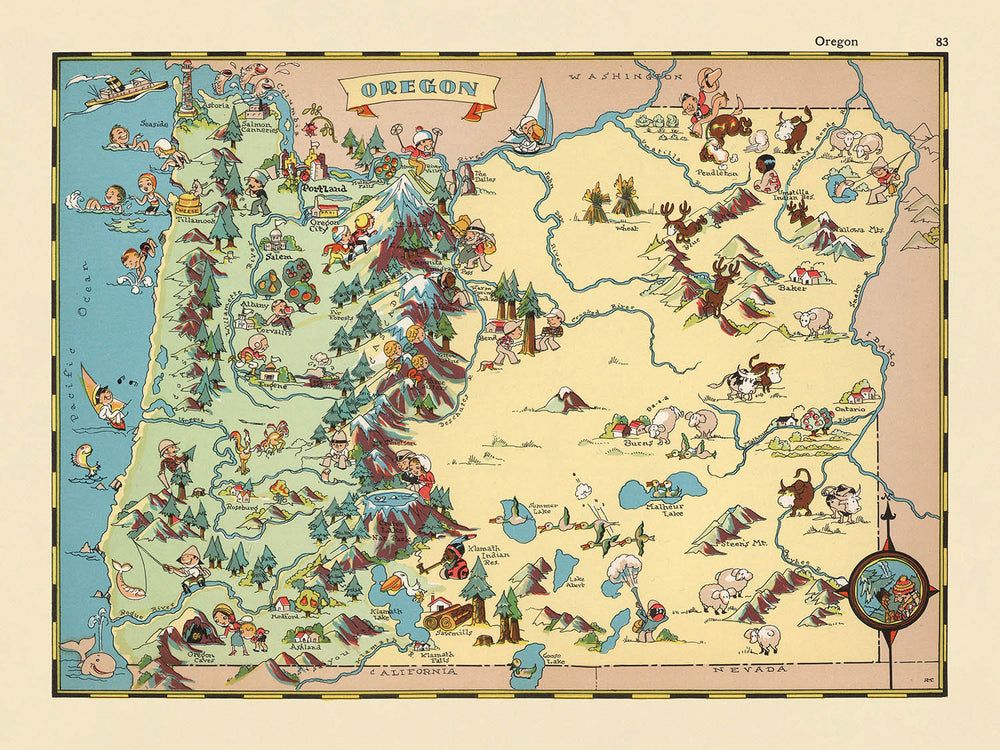 Pictorial Map of Oregon by Ruth Taylor White, 1935: Portland, Cascades, Timber, Columbia River, Coast