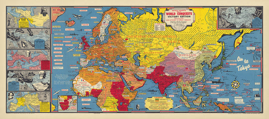 The "Dated Events Map of World Conquests, Victory Edition" is a captivating creation by the renowned mapmaker Stanley Turner, crafted in the pivotal year of 1945. This map offers a vivid portrayal of the Eastern Hemisphere during the tumultuous period of World War II. Turner, celebrated for his thematic and detailed cartographic works, has encapsulated the geopolitical shifts and power dynamics of the era with remarkable clarity. This map serves as both a historical document and a work of art, reflecting the complexities of global conflict and the eventual triumph of the Allied forces.