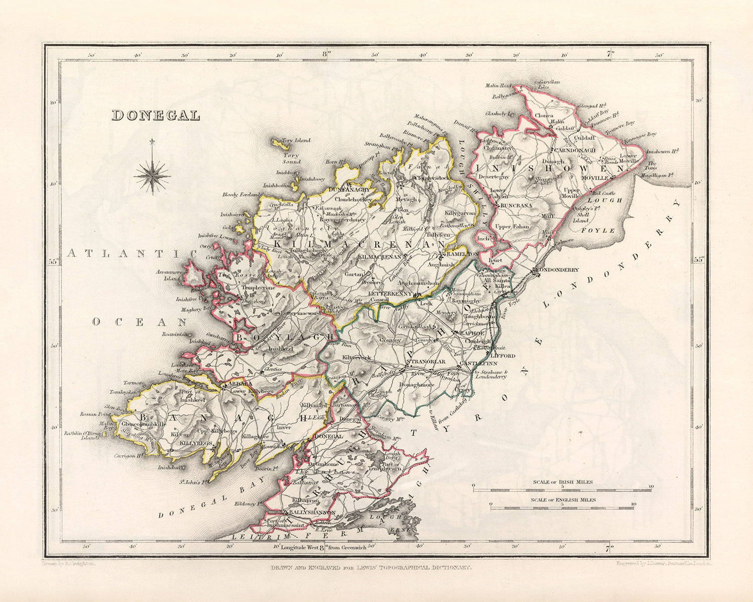Own a piece of history with the Old Map of Donegal by Samuel Lewis, 1844, and delve into the captivating past of County Donegal, Ireland. Explore the settlements, natural wonders, and historical events that shaped this remarkable region.