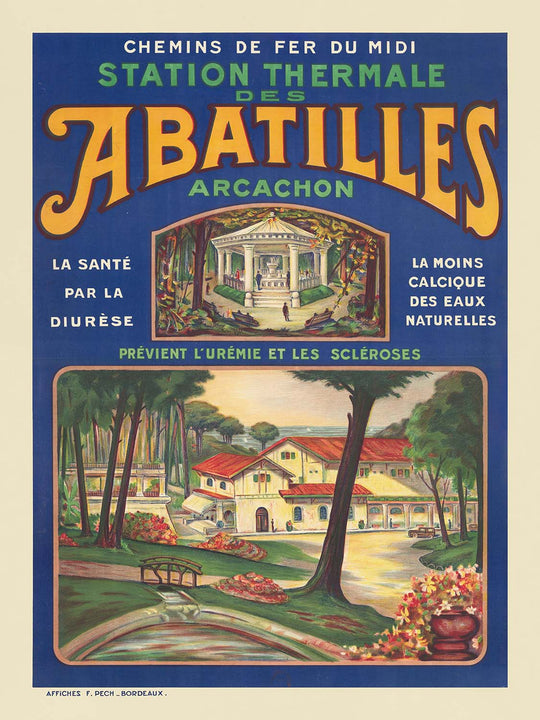 Chemins de Fer du Midi. Station thermale des Abatilles, Arcachon (1920) by Affiches F. Pech celebrates the pine-scented resort life of the Arcachon basin on France’s Atlantic coast. In this striking railway poster, giant honey-gold letters spelling ABATILLES arc across a deep blue field, framing a small vignette of a white spring pavilion above a larger scene of the spa buildings nestled among tall pines. In the foreground, a curved footbridge crosses a reflective basin, flowerbeds glow with warm reds, and a period motorcar pulls up beneath a long veranda—an irresistible invitation to arrive by train and take the waters.