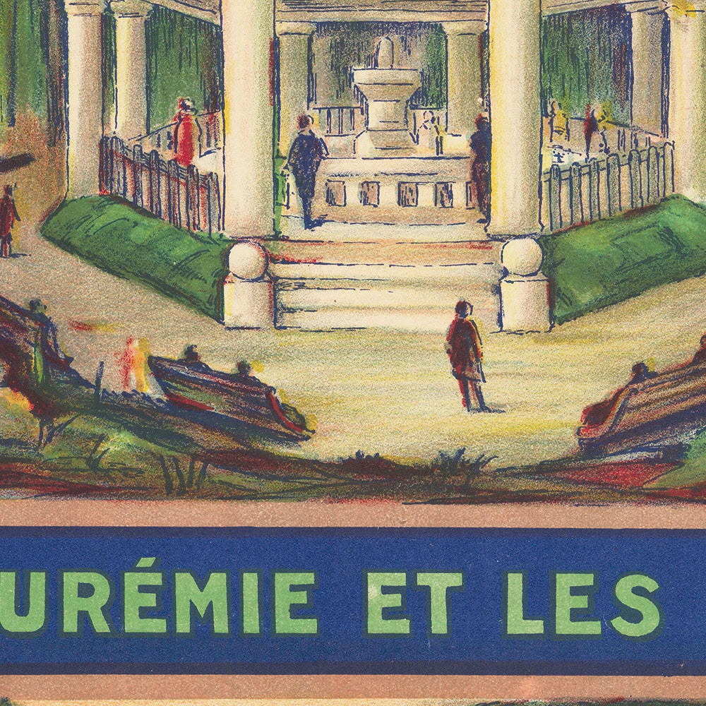 Why this poster matters: Arcachon was one of the great health and leisure resorts of the early 20th century, famed for pine forests, sea air, and mineral springs. The Abatilles quarter became synonymous with hydrotherapy and restorative walks beneath towering pines. The text woven into the design underscores the era’s medical promises: “La santé par la diurèse,” “La moins calcique des eaux naturelles,” and “Prévient l’urémie et les scléroses”—capturing the persuasive voice of railway advertising that encouraged elegant escape via the Chemins de Fer du Midi.