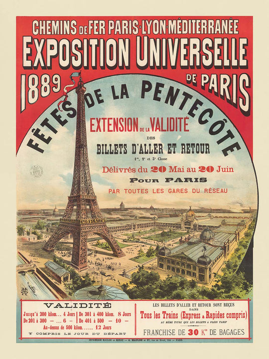 About the style: Rendered as a color lithograph, the composition balances spectacle and clarity. The beige ground and soft blue gradient give air and light to the scene, while the emphatic red header and black letterforms relay information with theatrical impact. The circular “window” of sky focuses the eye on the Eiffel Tower’s filigree ironwork, and the diagonal rail line animates the foreground—details that make this print both a historic document and a striking design object for contemporary interiors.