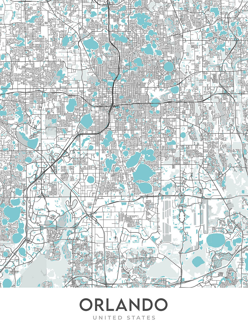 The map features a modern, detailed street map without labels, allowing you to easily navigate the city and discover new places to explore. The map also includes major roads and highways, as well as landmarks such as Lake Eola Park, the Orlando Museum of Art, and the Mennello Museum of American Art. This map is perfect for anyone who wants a stylish and informative way to explore the city of Orlando.