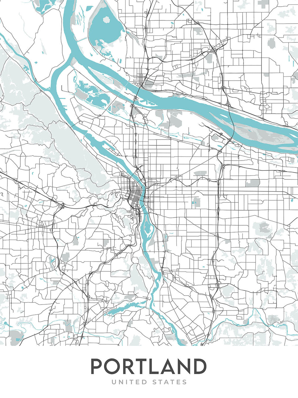 This map of Portland, Oregon, is a modern, detailed street map without labels. It focuses on the city of Portland and the surrounding areas, providing an accurate and visually appealing representation of the city's geography. The map covers a large area, including many of Portland's most popular neighborhoods, landmarks, and thoroughfares.