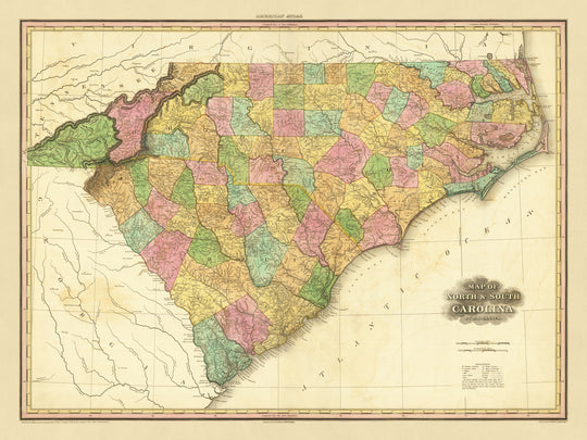 This beautifully detailed map of North & South Carolina was originally created by Henry Schenck Tanner in 1823. This map is a fascinating look at the Carolinas in the early 19th century.