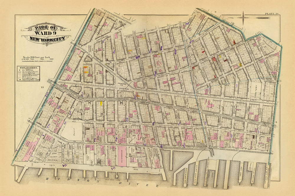 This remarkable 1879 map, focused on West Village portion of Greenwich Village, New York City, is a hand-colored lithographed piece by G.W. Bromley. It serves as a detailed depiction of this particular part of the city during the late 19th century. The map illustrates a vibrant urban area, rich with residential and commercial buildings, outlined meticulously to reflect the architectural fabric of the time. The color-coding indicates building materials, with pink tones suggesting brick structures, a hallmark of the period's construction.