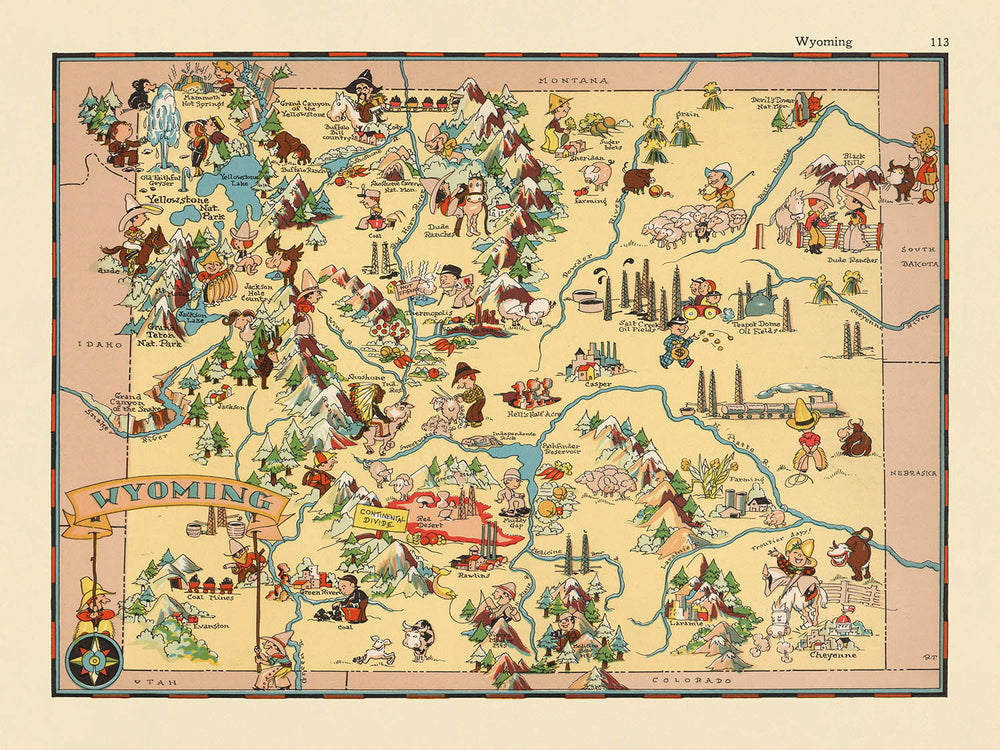 Pictorial Map of Wyoming by Ruth Taylor White, 1935: Yellowstone, Grand Teton, Continental Divide, Wind River Range, Bighorn Mountains