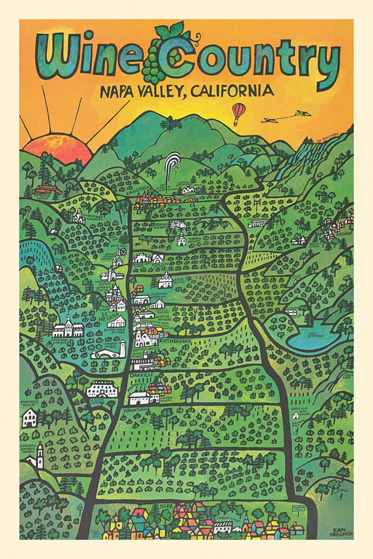 The vibrant use of color and whimsical style encapsulate the lushness and richness of the Napa landscape, making it a delightful piece to own or gift. It is perfect for adorning modern living spaces or academic offices alike, serving as a conversation starter or nostalgic reminder of the region's vinous heritage.