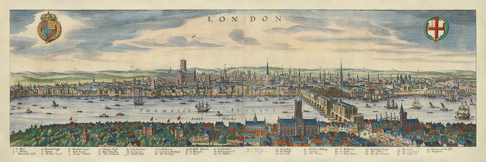 Merian, a celebrated Swiss engraver and publisher, was renowned for his meticulous city views, and this map stands among his finest achievements. His attention to detail is evident in the dense clusters of buildings, the intricate city walls, and the bustling riverside, all rendered with remarkable clarity. The map’s key, noting 43 significant locations, guides the viewer through a city teeming with life and history. Merian’s perspective not only captures the city’s physical layout but also its spirit, preserving a vision of London that has long since vanished.