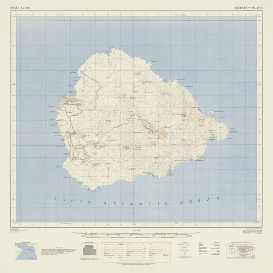 Ascension Island itself is a place of intrigue, with its rugged terrain dominated by the majestic Green Mountain. This map beautifully illustrates the island's contours, from its highest peaks to the coastal outlines caressed by the South Atlantic Ocean. The inclusion of roads and pathways offers insight into the island's infrastructure during a pivotal time in its history, making it a valuable resource for historians and enthusiasts alike.