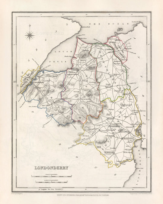 Owning this Old Map of Londonderry by Samuel Lewis in 1844 allows you to immerse yourself in the rich history and captivating landscapes of County Londonderry, Ireland. It is a remarkable piece that will not only serve as a beautiful decoration but also spark curiosity and conversation about the region's past.