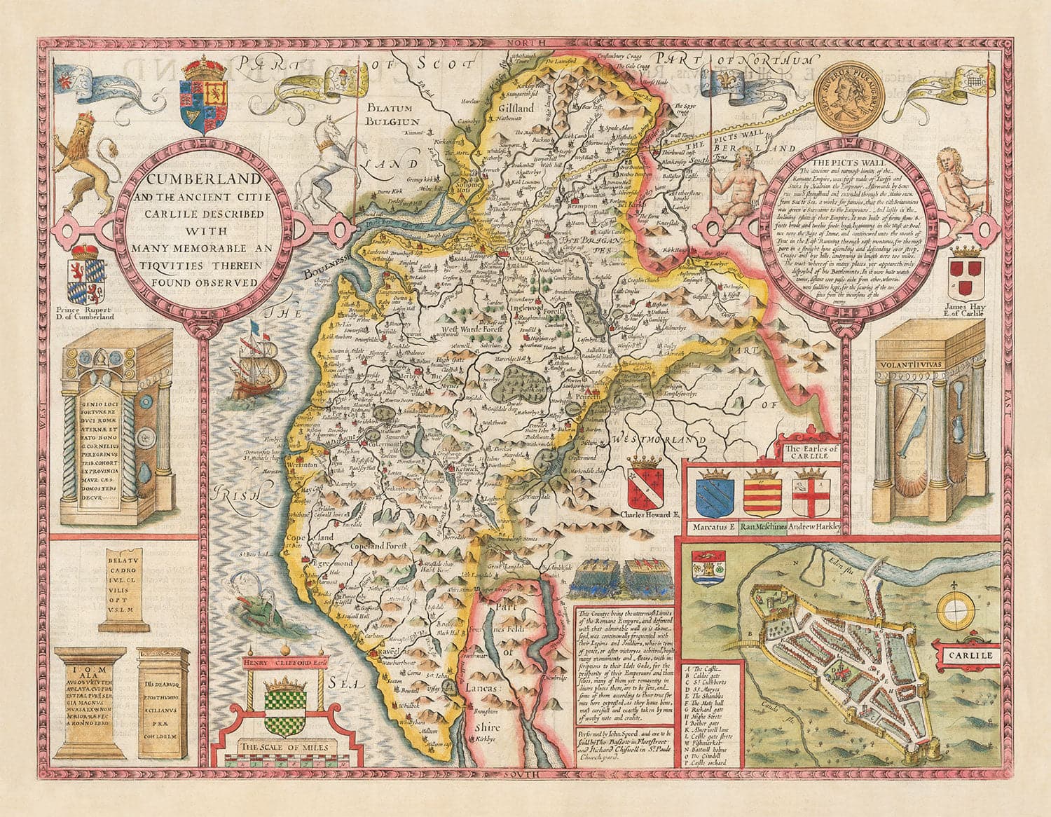 Old Map of Cumbria, 1611 by John Speed: Cumberland, Carlisle, Keswick, Lake District, Windermere