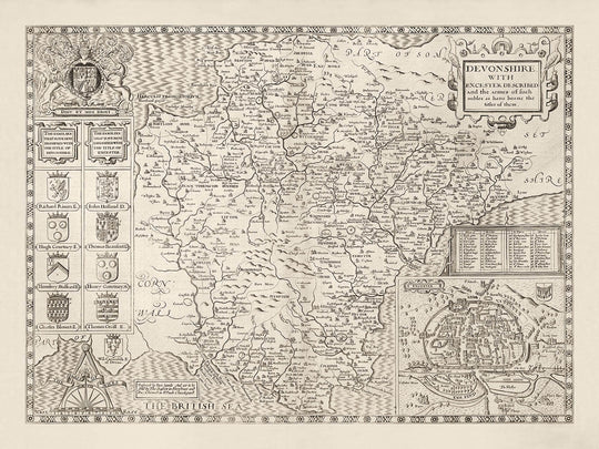 Old Map of Devon, 1611 by John Speed: Plymouth, Exeter, Torquay, Paignton, Exmouth, Barnstaple