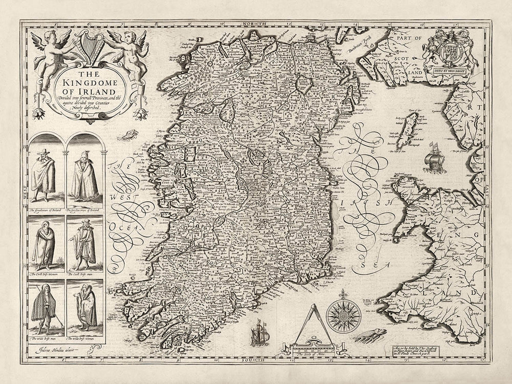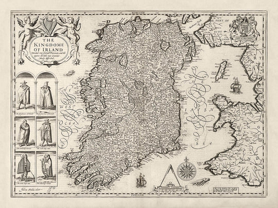 In the top left is a beautiful cartouche declaring that the map is the Kingdom of Ireland. Below it are engravings of Irish gentlemen and commoners.