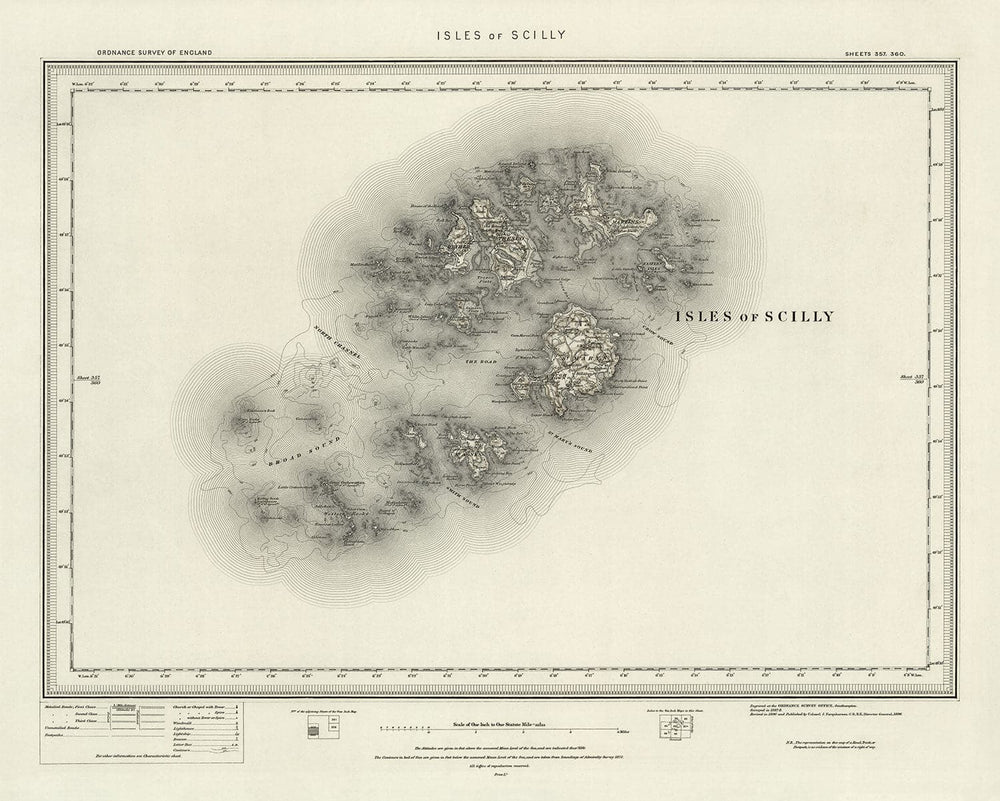 The map shows all of the inhabited islands of Scilly, including St Mary's, Tresco, St Martin's, St Agnes and Bryher. The map is incredibly detailed, though - all of the various uninhabited rocks and islets are also shown here, including their elevations above sea level.