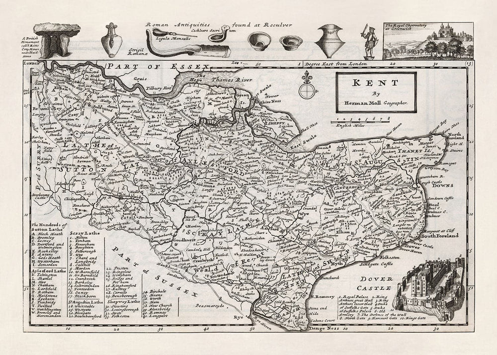 Moll's county maps are adorned with interesting views and curios - in this case, a detailed engraving of Dover Castle in the bottom right, some Roman Antiquities apparently found at Reculver, and a lovely sketch of the Greenwich Observatory.