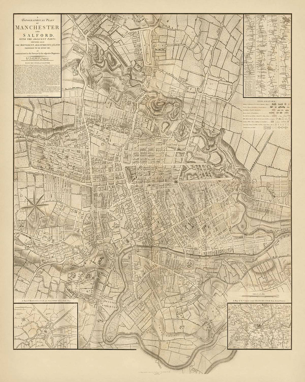 Overall, Laurent’s map is not just a practical tool for navigation but a beautiful work of art that captures the spirit of a city on the brink of transformation. It invites viewers to explore the streets, neighborhoods, and landmarks that defined Manchester in 1793, offering a unique perspective on the city’s past. This map is a treasure for collectors and history enthusiasts alike, embodying the rich tapestry of Manchester’s history and its enduring legacy.
