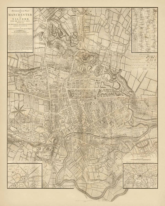 A captivating piece of cartographic history, "A Topographical Plan of Manchester and Salford with the Adjacent Parts" from 1793 offers a rare glimpse into the burgeoning urban landscape of Manchester during the late 18th century. Crafted by Charles Laurent, this map is not only a testament to the meticulous art of early surveying but also a reflection of the city's rapid development. Laurent, seizing an opportunity to publish before the renowned William Greene, skillfully utilized Greene’s survey data to create this detailed depiction of Manchester, showcasing the planned developments that would shape the city’s future.