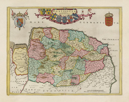 Old Map of Norfolk in 1665 by Joan Blaeu: Norwich, Great Yarmouth, King's Lynn, Thetford, Swaffham, Fakenham, East Anglia
