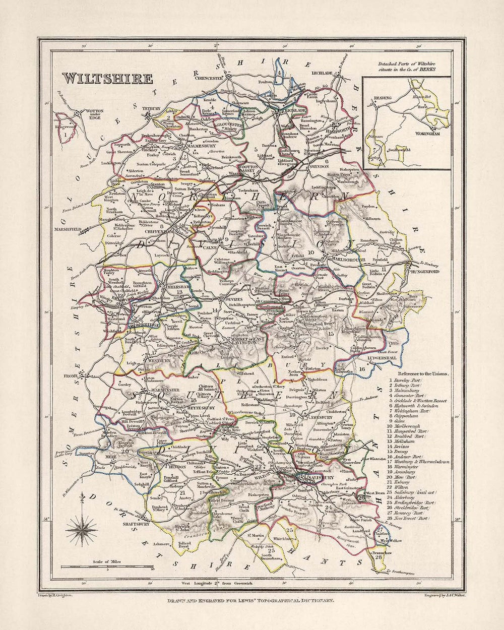 Own a piece of history with this Old Map of Wiltshire by Samuel Lewis, 1844. Immerse yourself in the rich heritage of the county, explore its captivating towns and cities, and marvel at the intricate details of this historical cartographic masterpiece.