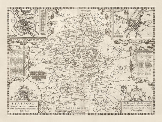 This old, monochrome and wonderful map shows the ancient county of Staffordshire as it was in 1611. It was created by John Speed and engraved by Jodocus Hondius, and originally published in Speed's "The Theatre of the Empire of Great Britaine".