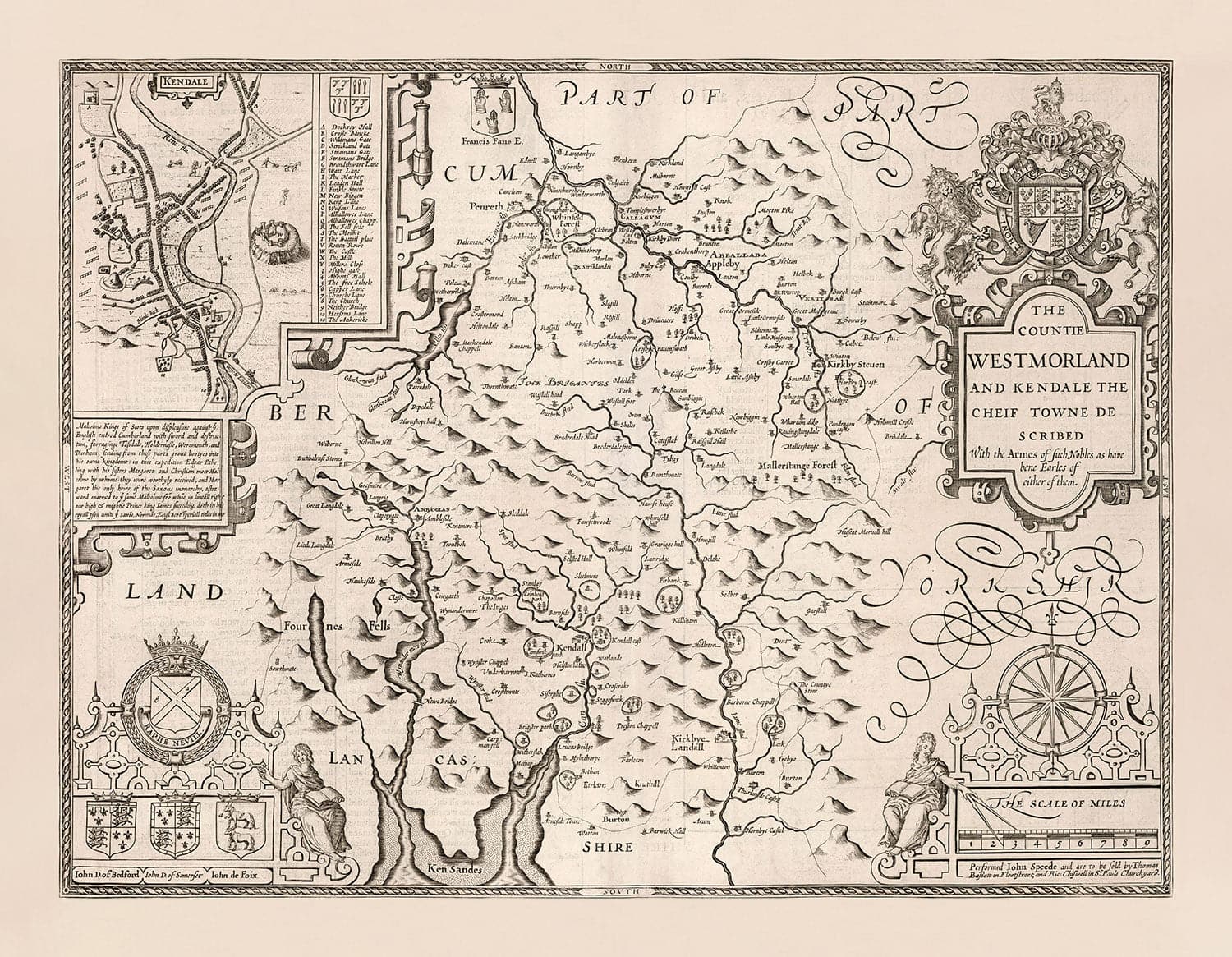 In the top right is a detailed engraving of Kendal, then the county seat and previously the centre of the Barony of Kendal - which would become Westmorland.