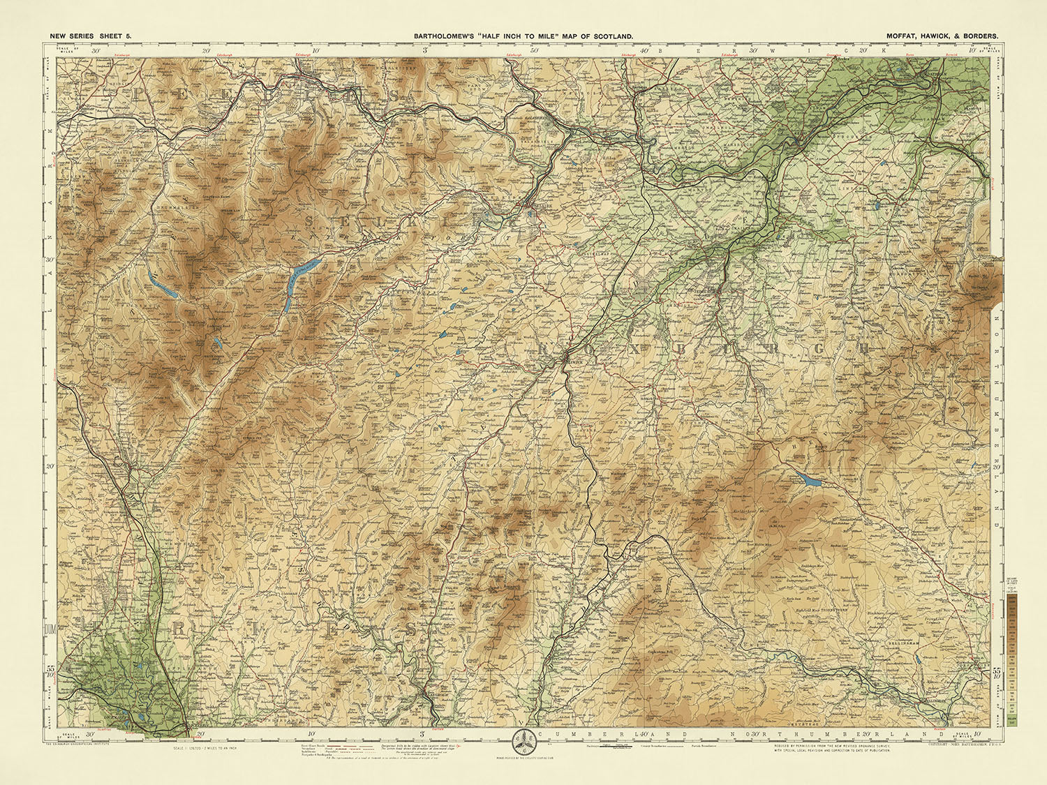 Sheet 5 - Moffat, Hawick & Border, crafted by the esteemed J.G. Bartholomew in 1901, is a captivating representation of early 20th-century cartographic artistry. Bartholomew, a renowned Scottish cartographer, was celebrated for his meticulous attention to detail and innovative techniques. This map, part of Bartholomew's flagship series, was designed at a half-inch to the mile scale (1:126,720), making it an indispensable tool for cyclists and tourists of the era. The map's clarity and attractiveness are evident in its precise depiction of political boundaries and physical features, reflecting Bartholomew's commitment to both accuracy and aesthetic appeal.