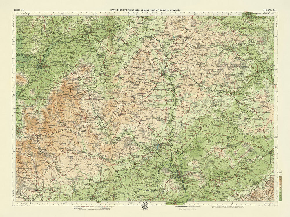 Sheet 24 - Oxford, created by the illustrious JG Bartholomew in 1901, is a captivating piece of cartographic history. This map, part of Bartholomew's flagship half-inch to the mile series, offers a detailed and colorful representation of the Oxford region, making it a cherished artifact for both history enthusiasts and map collectors. Bartholomew, a renowned Scottish cartographer, was celebrated for his innovative approach to map design, and this particular map exemplifies his mastery. The meticulous gradation of color bands to depict landscape relief is a testament to his skill, providing a vivid and nuanced portrayal of the terrain.