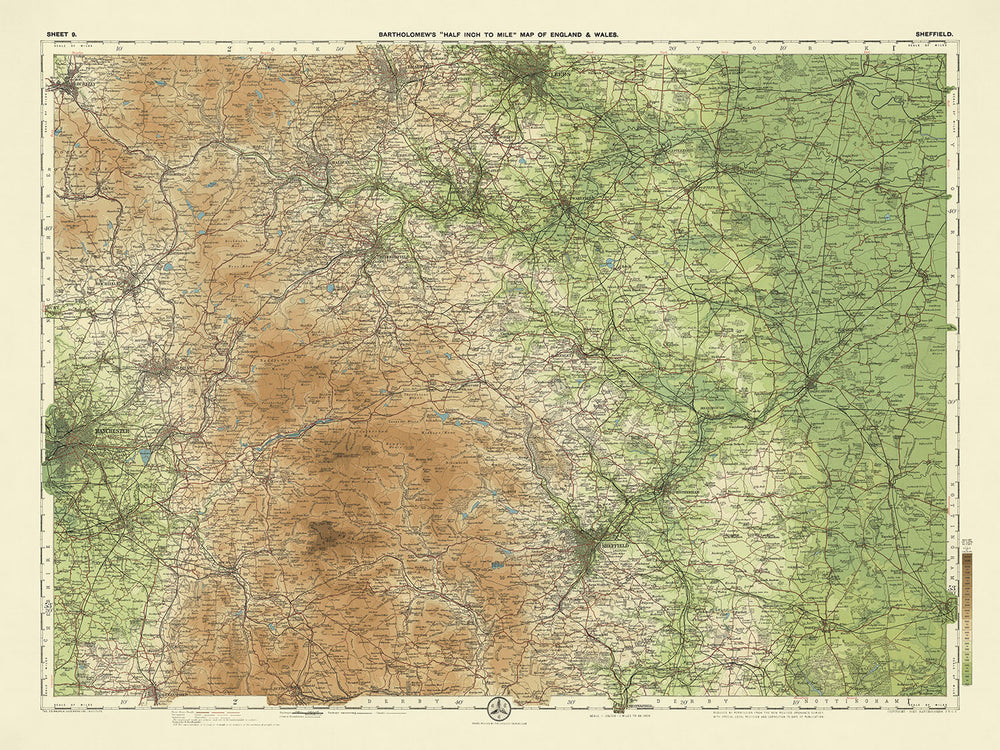 Bartholomew's Sheet 9 - Sheffield is not just a map; it is a historical document that offers a window into the past. It captures the essence of the region's geography, from the rolling hills and verdant valleys to the bustling cities and tranquil rivers. This map is a celebration of the rich tapestry of natural and human history that defines central and northern England, making it a valuable addition to any collection of historical maps.