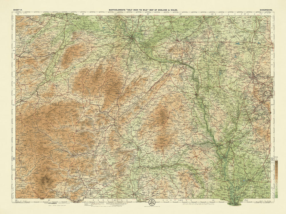 The towns and cities of Shropshire are intricately detailed, reflecting the region's vibrant communities. From the bustling market town of Ludlow to the tranquil village of Much Wenlock, each settlement is marked with care. The map also includes smaller towns such as Clun and Bishop's Castle, each with its unique charm and historical significance. By capturing the essence of these towns and their surroundings, Bartholomew's map offers a comprehensive view of Shropshire, making it an invaluable addition to any collection of historical maps.