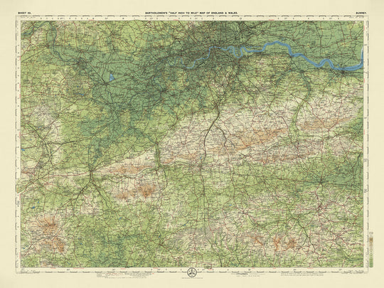 Step into the past with the exquisite "Sheet 30 - Surrey," a masterpiece crafted by the renowned cartographer JG Bartholomew in 1901. This map, a part of Bartholomew's celebrated Half-Inch to the Mile series, is a testament to the artistry and precision of early 20th-century cartography. Bartholomew, a luminary in the field, was known for his innovative techniques and meticulous attention to detail. His maps were not just navigational tools but works of art that captured the imagination of cyclists, tourists, and geography enthusiasts alike.