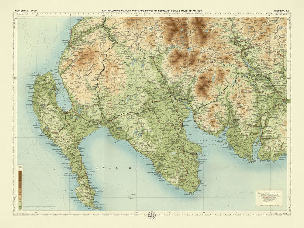 Covering an area of 36 miles from north to south and 52 miles from west to east, this map offers a comprehensive view of the Wigtown region in Scotland. It highlights significant geographical features such as Luce Bay and Wigtown Bay, as well as the prominent Rhins of Galloway peninsula. The Mull of Galloway, Scotland's southernmost point, is also prominently featured, along with the notable hills of Cairnsmore of Fleet and Cairnsmore of Carsphairn. These natural landmarks are intricately detailed, showcasing Bartholomew's commitment to accuracy and his deep understanding of the region's topography.