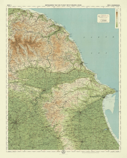 Sheet 7 - York & Scarborough, created by the esteemed cartographer J.G. Bartholomew in 1901, is a masterful representation of early 20th-century cartographic artistry. This map, part of Bartholomew's flagship Half-Inch series, was designed with cyclists and tourists in mind, offering a detailed and colourful depiction of the Yorkshire region. The map’s innovative use of colour gradation to represent landscape relief showcases Bartholomew's pioneering techniques, making it not only a functional tool for navigation but also a visually stunning piece of art.