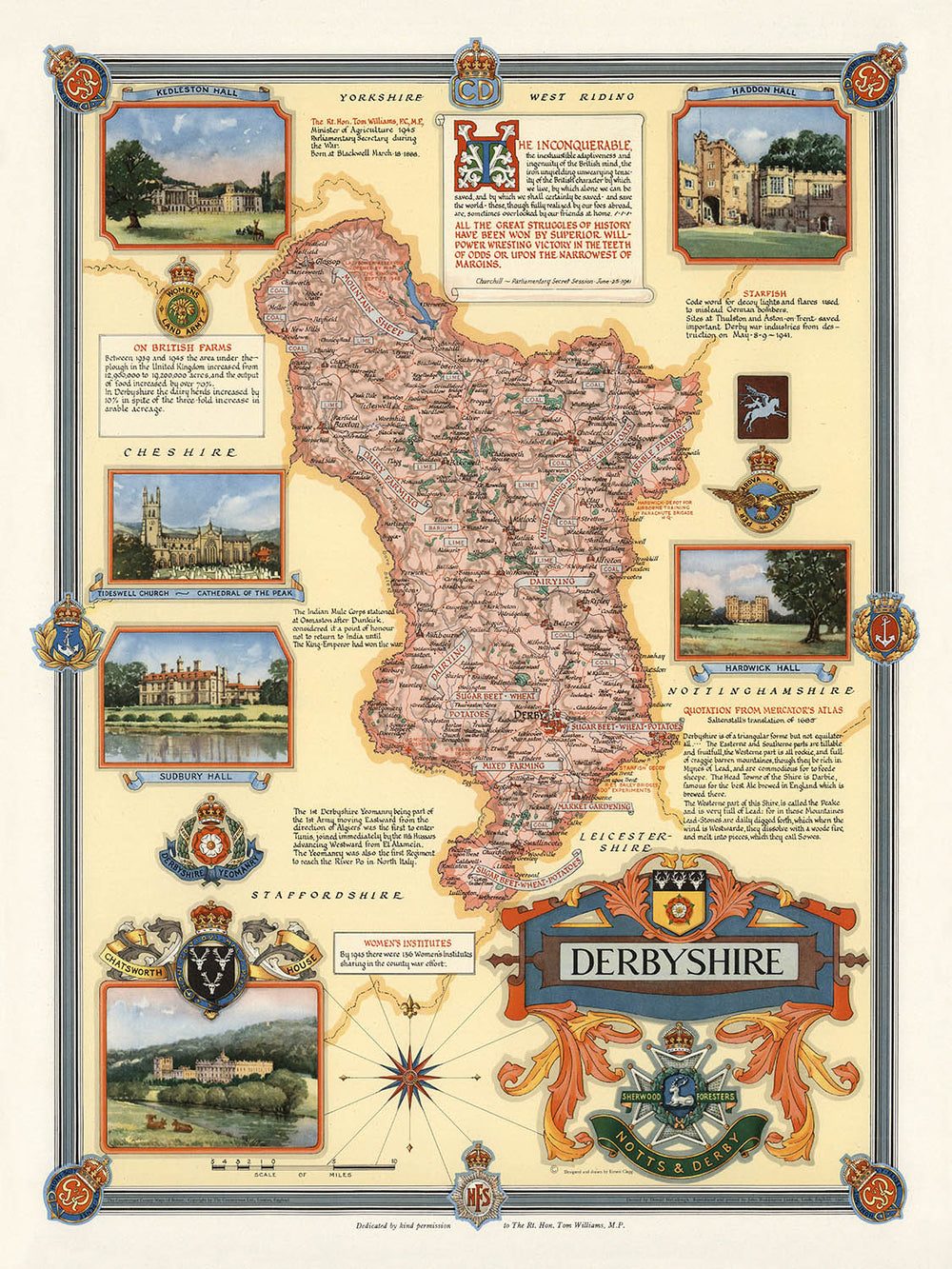 In addition to its aesthetic and historical value, the map serves as a tribute to the people and places that define Derbyshire. The dedication to the Rt Hon. Tom Williams, M.P., and the notes on the Women's Institutes, emphasize the communal and agricultural contributions that were vital during World War II. This map is a testament to the collective effort and resilience of the Derbyshire community, making it a cherished piece for historians, collectors, and anyone with an appreciation for the art of cartography.