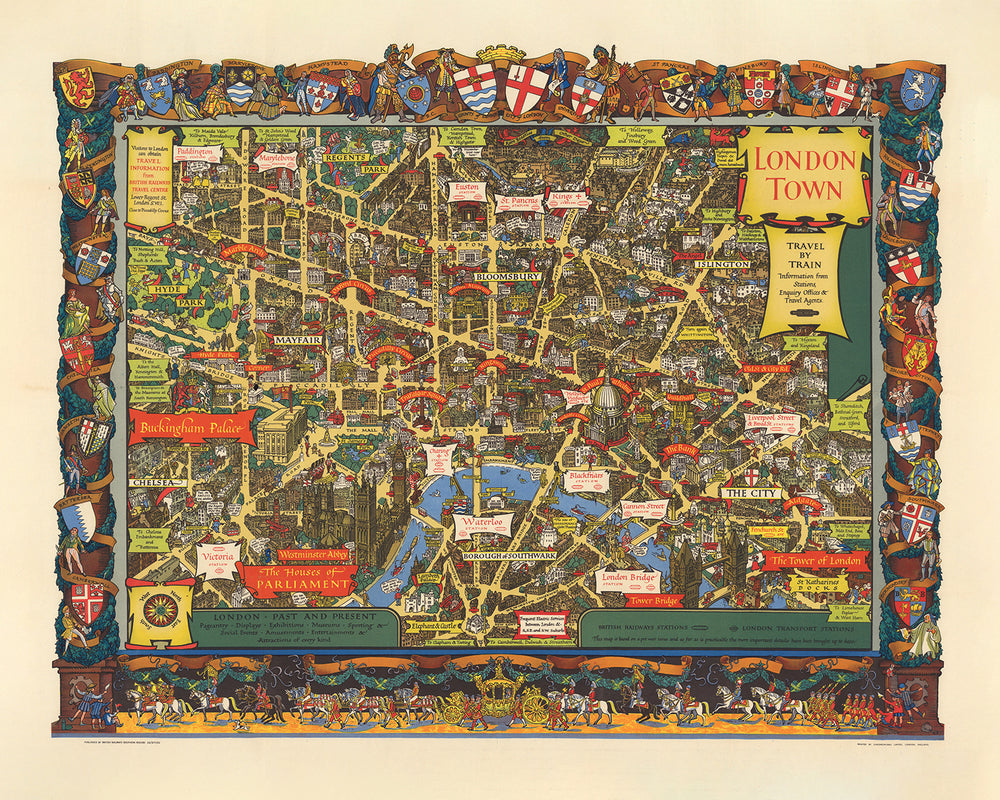 Old Pictorial Map of London Town by British Railways & Kerry Lee, 1953: Tower of London, Parliament, Buckingham Palace, St. Paul's Cathedral