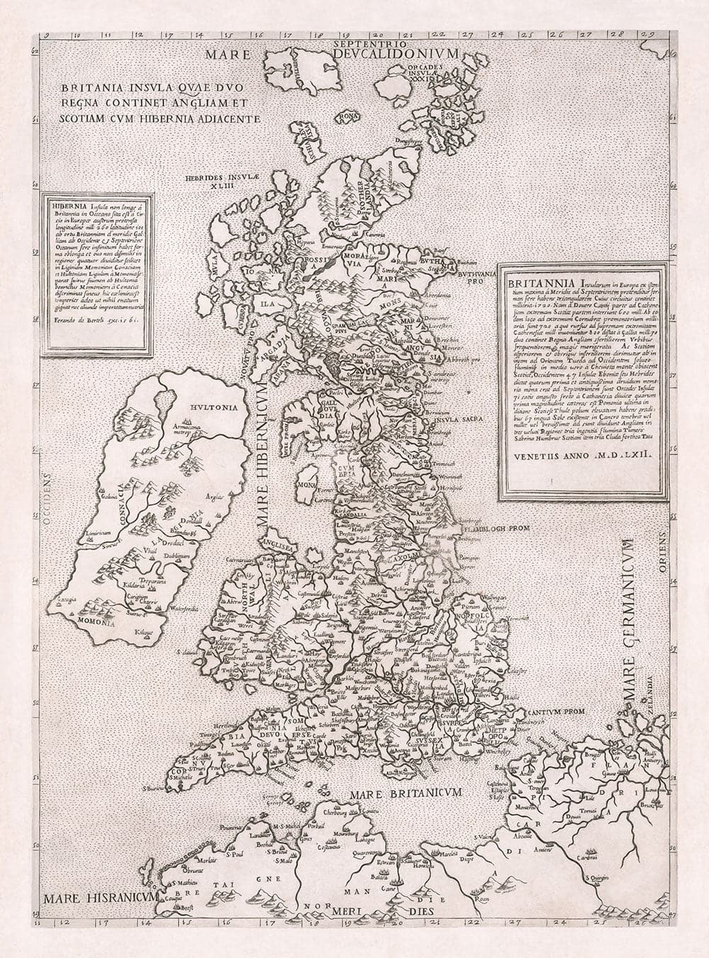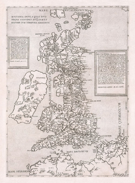 The two inset descriptive panels give a textual description of Ireland and Great Britain... but written in Latin, so you may need a dictionary to decipher them.