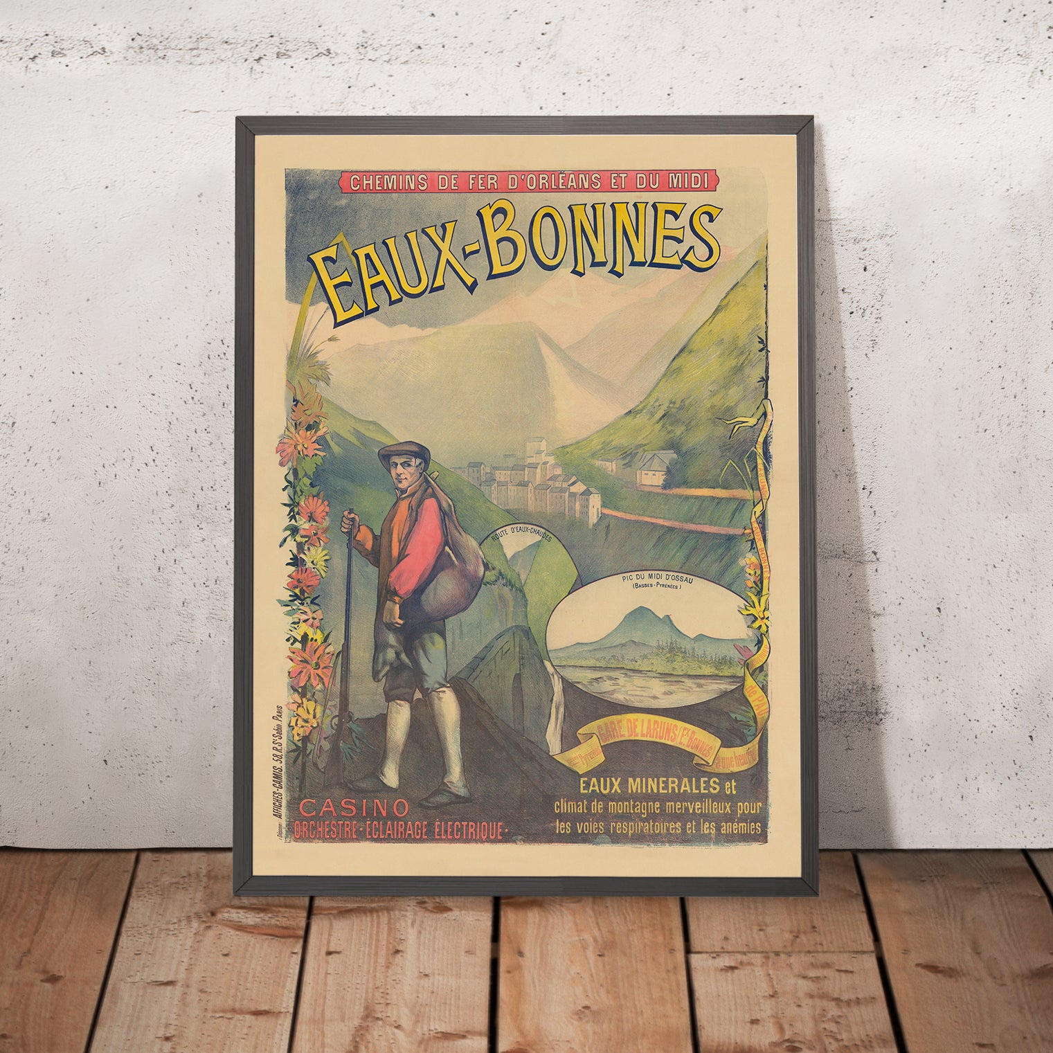 About the place: Eaux‑Bonnes lies in the Ossau Valley of Béarn, a short journey from Pau, and just below the serrated silhouette of the Pic du Midi d’Ossau. Nineteenth‑century visitors came for the spa cures and the invigorating mountain climate, with excursions along the “ROUTE D’EAUX‑CHAUDES” and into high pastures. This poster captures that era when railways like the Chemins de Fer d’Orléans et du Midi opened the Pyrenees to elegant leisure—promenades, concerts at the Casino, and scenic drives to waterfalls and viewpoints.